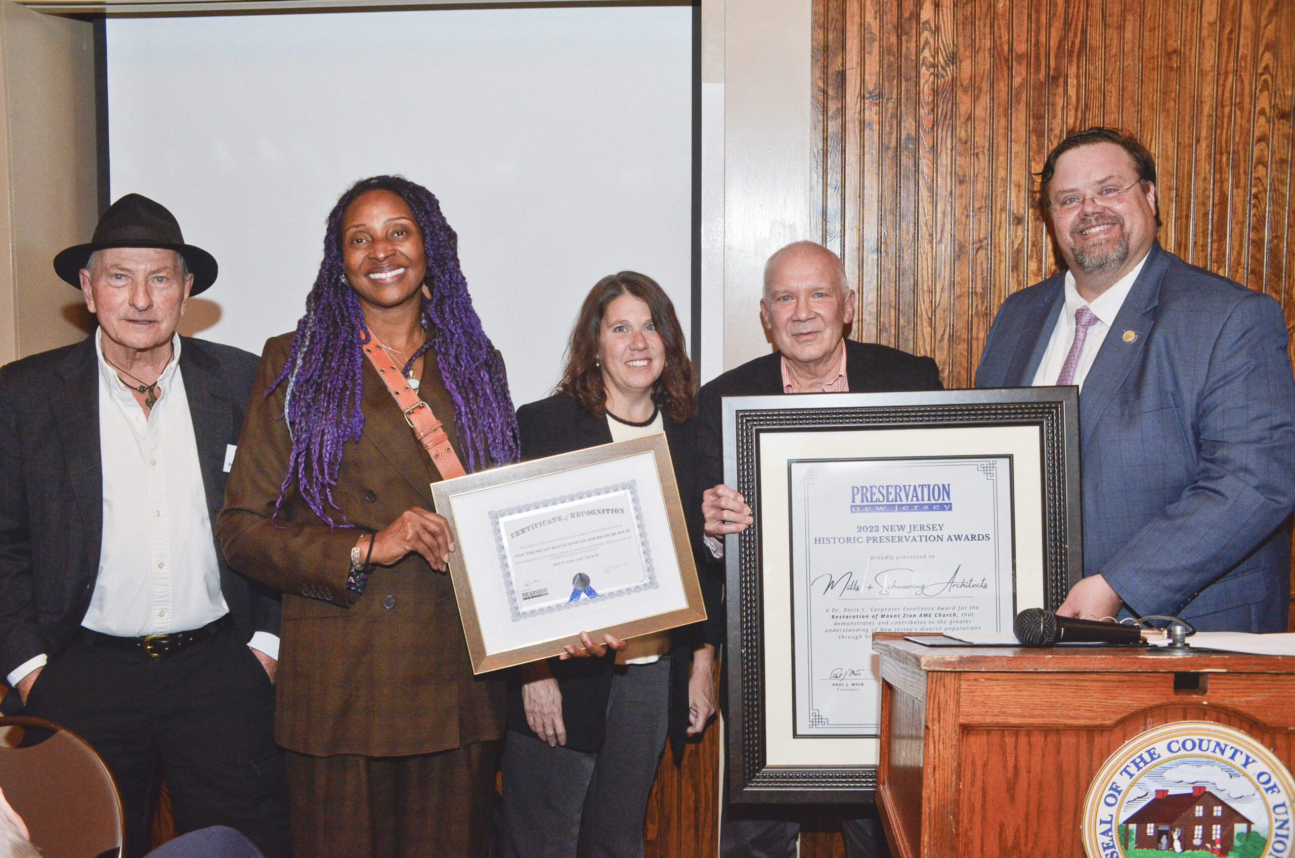 “The Doris Carpenter Award means a great deal to the Stoutsburg Sourland African American Museum. It is a recognition and validation of their work to educate the public about the experiences and the contributions of the African American community in the Sourland region. We were pleased to be the architect for the restoration of the one room church to become a museum, and are honored and grateful for this prestigious award from Preservation New Jersey,” shared by Michael J. Mills, FAIA Partner of Mills + Schnoering Architects, LLC.